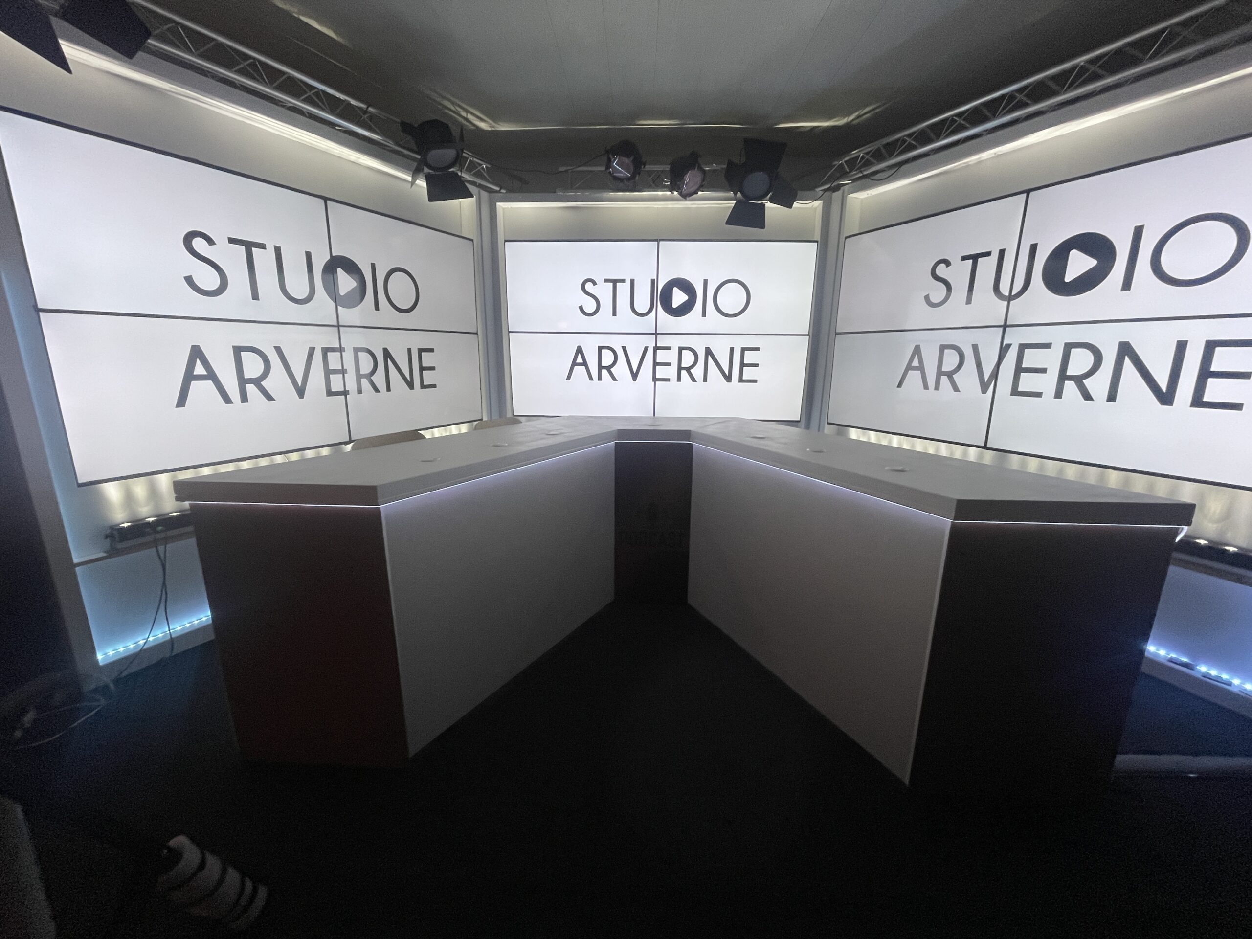 Studio personnalisable à votre image ou à celle de vos partenaires grâce aux écrans disposés sur le plateau et un éclairage modulable.